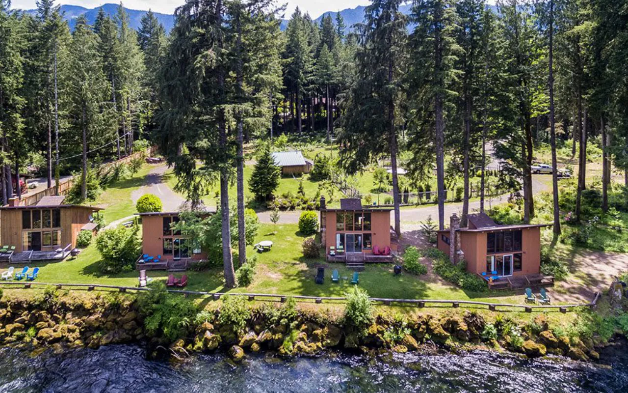 Built in the ’60s, there are four riverfront cabins each with full kitchens, a queen bed plus a futon sofa, radiant heated stone floors, and a crackling wood-burning fireplace. Floor-to-ceiling windows let the McKenzie River’s crystal-clear water be your morning coffee view.