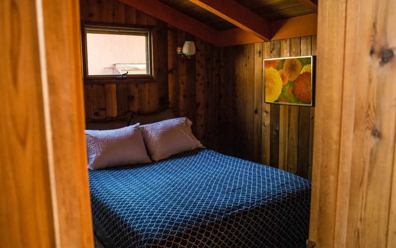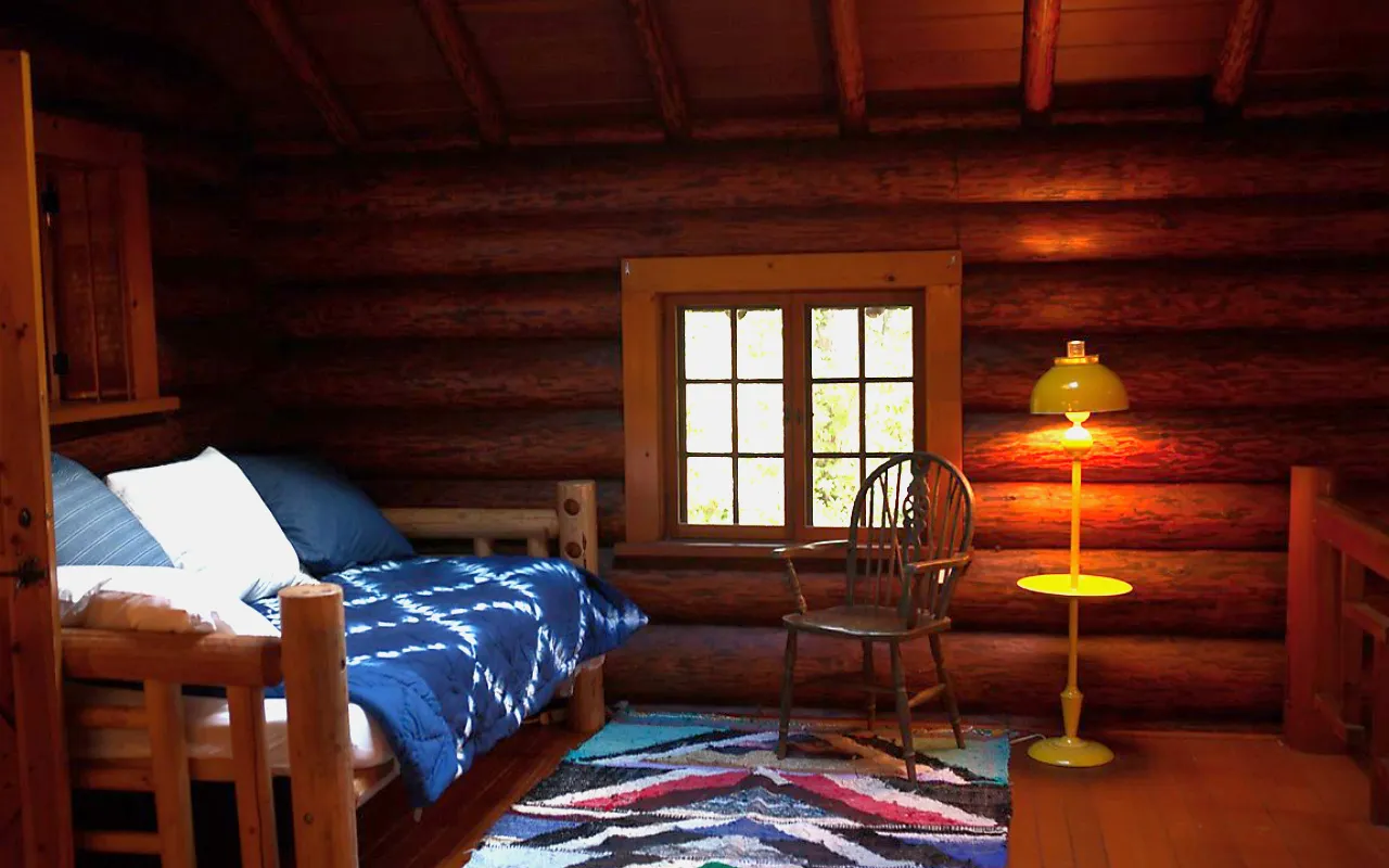 The Family Cabin, a log “little house” from 1927, sleeps up to 6. It’s laid out cozy-style: a master bedroom with dreamy views, a lofted area with low queen beds under skylights, and the gentle sound of river-fogged mornings drifting in.